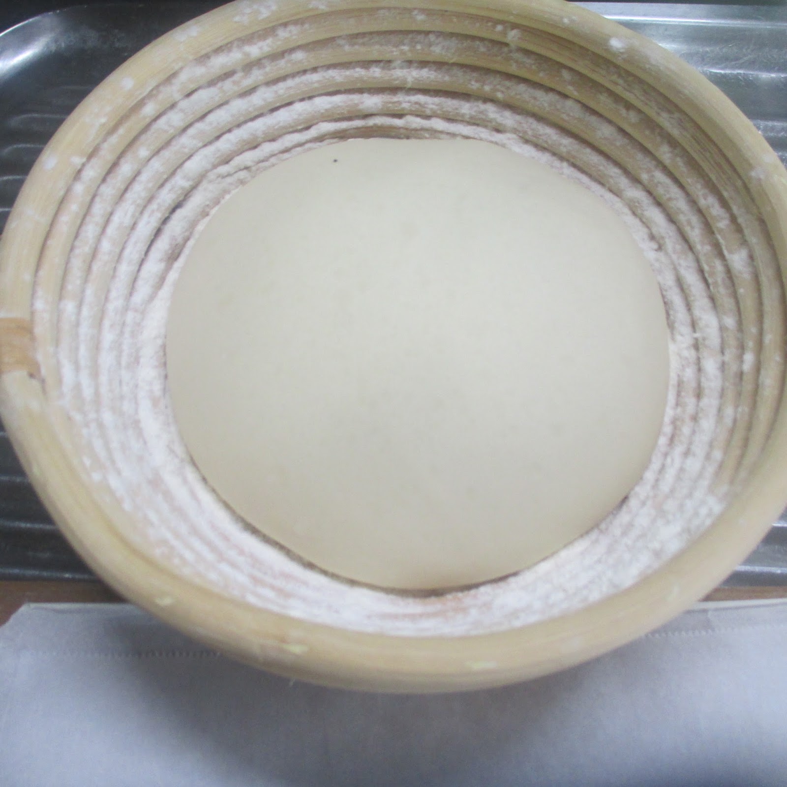 *耐熱容器から生地を取り出して台上に載せ丸く成形しでコルプ型に入れベカリーオーブンの下段で40分間発酵させました。